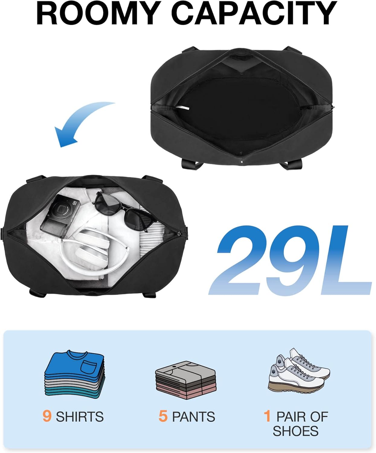 Foldable Duffle bag for Spirit Airlines, BAGSMART Tote Travel Gym Bag for women, Carry On Weekender Overnight Bag for Travel Essentials, Black