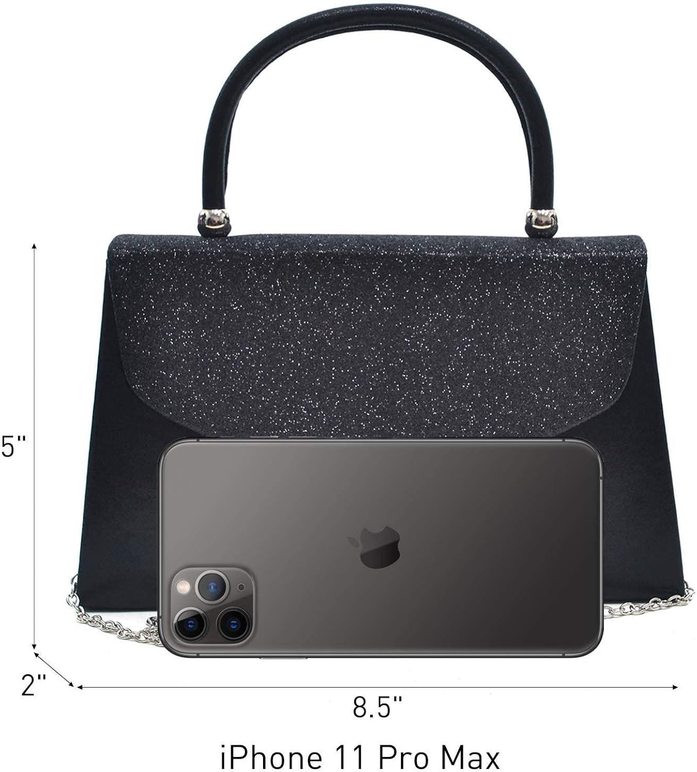 Polyester Imported MATERIAL: Made from high quality polyester with frosted glitters. Soft fabric lining. SIZE: 8.5"W x 5.0"H x 2.0"D, can easily fit a cell phone, wallet, compact mirror, lip gloss, and a pack of gum. DESIGN: Elegant evening bag / party clutch for women, top round handle. Frosted with glistening sheen on the front flap, detachable chain strap, lining with a slip pocket. DETAILS: Silver tone hardware. Envelop flap-over with snap closure for easy access to secret essentials. OCCAIONS: Perfect for wedding, Party, Prom, Ball and best gifts for girl friend, wife, lover and friend.