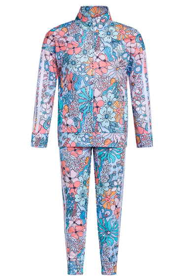 The top features a long sleeve full zip jacket with a seasonal full print, 3-Stripe down sleeves, princess stitching and an adidas logo embroidered on the chest.