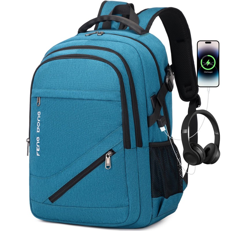 FENGDONG Durable Waterproof Travel Large Laptop Backpack 17.3 inch,College Backpack Bookbag for Men & Women Business Backpack with USB Charging Port and Headset Port Blue
