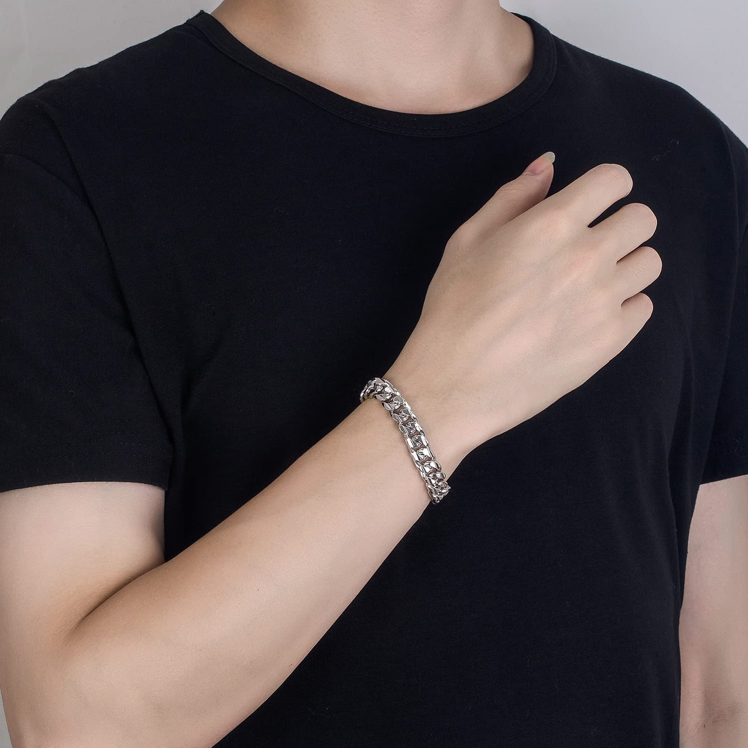 • A MODERN CLASSIC - Add style to a basic look with this Solid Sterling Silver 6.5-13mm Cuban Bracelet. Our flat diamond-cut beveled links are more reflective than standard whip chains for a rich, flawless shine. Sturdy and durable enough for everyday wear, but not too thick and comfortable to wear. A chain brings modern elegance to both casual and formal wear, and can be worn alone for an elegant everyday look, or layered with other bracelets for a stylish look.