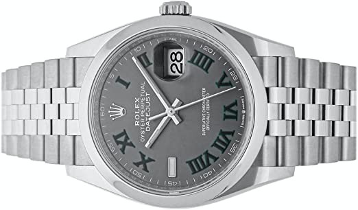 Rolex Datejust 36 126200-0017. This 36mm watch features a stainless steel case with a smooth domed bezel and comes with a Jubilee bracelet. The slate grey Wimbledon dial features Roman numeral hour markers and the date is displayed under a Cyclops lens at 3 o'clock. It is powered by the Rolex Caliber 3235 self-winding automatic COSC Super Chronograph certified movement with a 70-hour power reserve.
